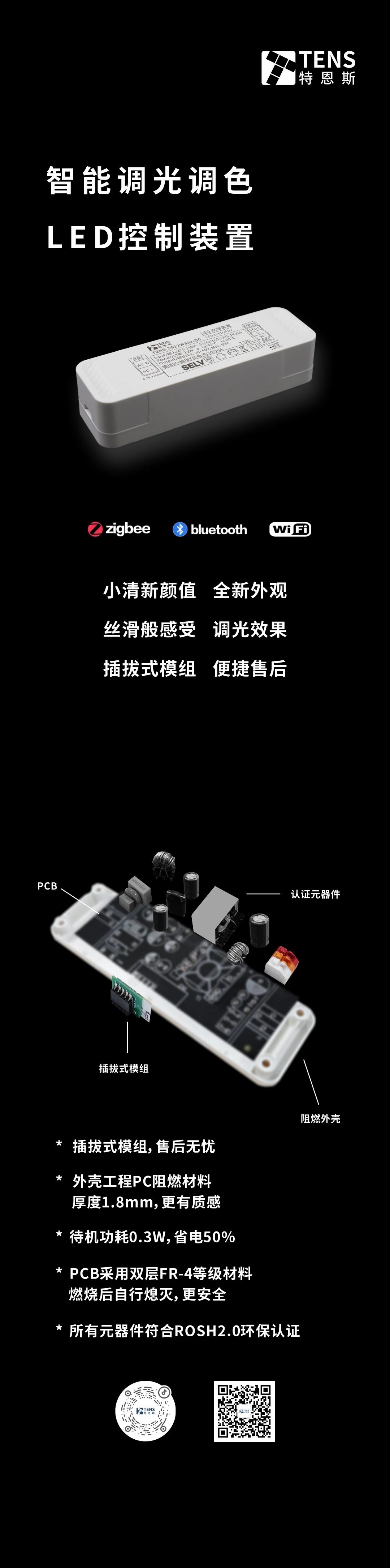 真斷電技術,拒絕關燈微亮,待機功耗低至0.3W,小清新外觀設計,全程調光調色不抖動,插拔式模組,售后無憂